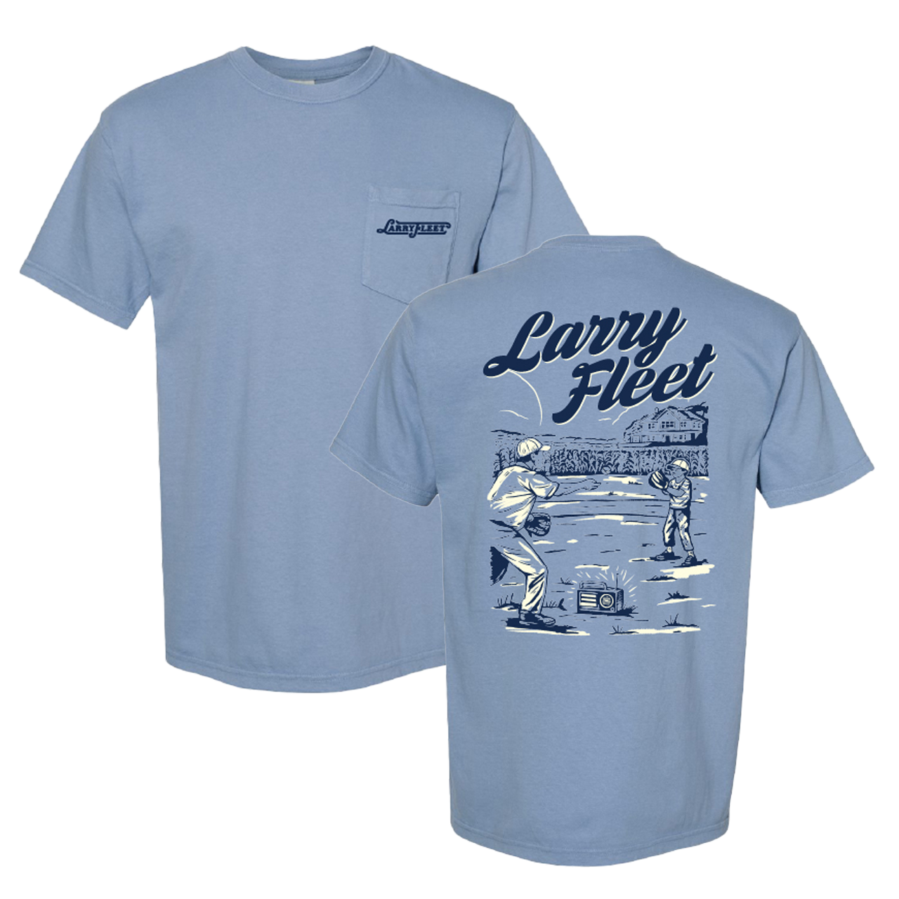 This blue pocket tee features a Larry Fleet logo on the front left chest, and a "Baseball On The Radio" graphic on the back.